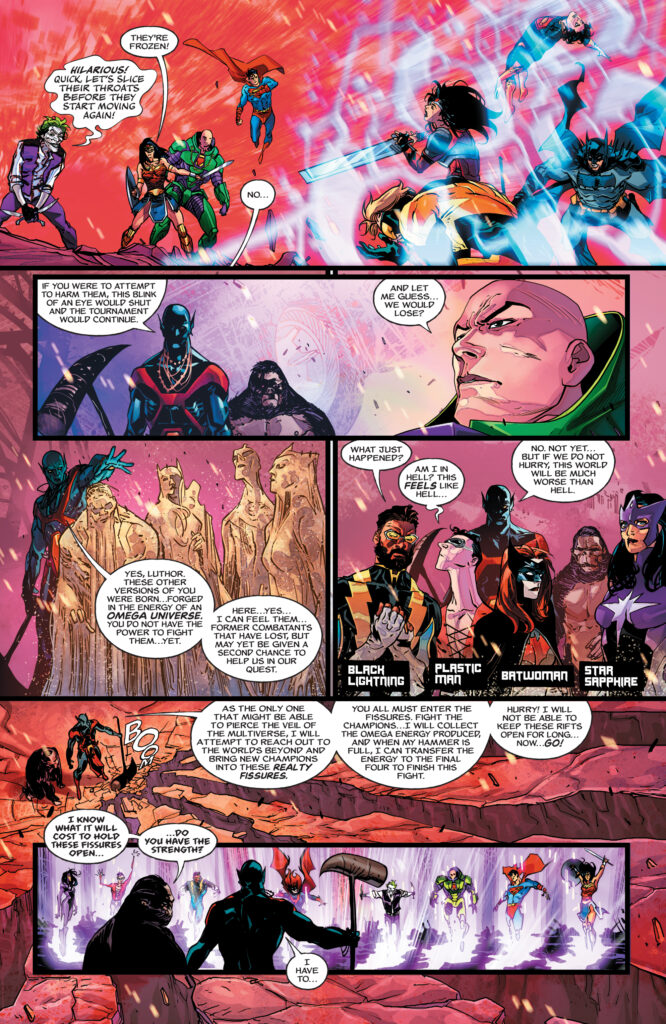 Wait… What? WHO?! As the remaining champions in the K.O. tournament prepare for the final rounds, they discover that there isn’t enough Omega energy left to crown the winner a King Omega. To have any hope of stopping Darkseid, they’ll need to engage in combat with the champions of other worlds beyond our own including Annabelle, Homelander, Sub-Zero, and more! This shocking, star-studded crossover sets the stage for the final chapters of the epic DC K.O. event and features matchups you never imagined possible. The ultimate battle is only beginning!