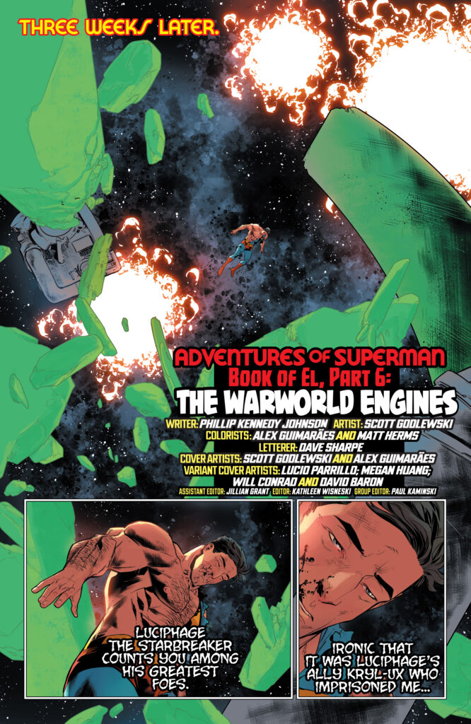 A roving gang of Warworld Phaelosians is towing precious cargo! To retrieve it, Superman will have to beat them at their own warp-speed game—and engage the fearless Valkyries! Ronan Kent has been an essential ally, but he’s been secretly accessing information from a twisted source. Can Superman trust a man who’s been listening to enemy whispers? Kryl-Ux has five of the seven god-aspects of Olgrun, and time is running out to save Osul and Otho-Ra.