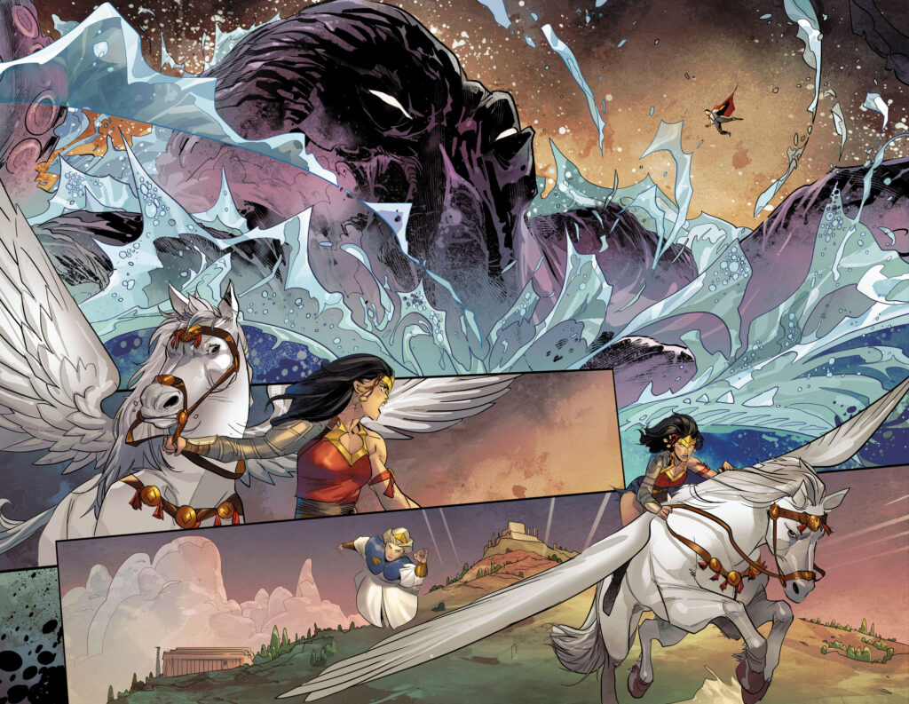 The 12 issue series acts as a sequel to the original series ‘Dark Knights Of Steel‘ and will usher in a new age of war, magic and destiny. As the great houses of El and Wayne, the Kingdom of Storms, and the Amazons brace for the return of an escalating conflict, the peace forged at the end of the first series stands on the brink of collapse. Here’s a look at the main cover by Yasmin Putri and variants by Travis Moore and Tamra Bonvillain and David Paratore. There are also variants available by Joshua Middleton.